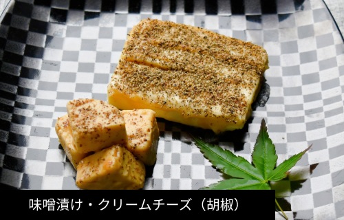 | 原材料 | ・クリームチーズ 白味噌(酒・みりん・濃口醤油・砂糖) ・クリームチーズ(はちみつ) 白味噌(酒・みりん・濃口醤油・砂糖) ・クリームチーズ(黒コショウ) 白味噌(酒・みりん・濃口醤油・砂糖) |
