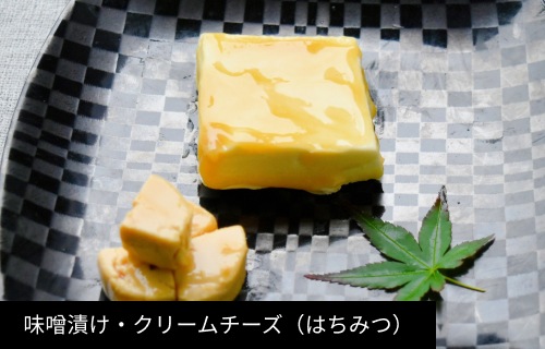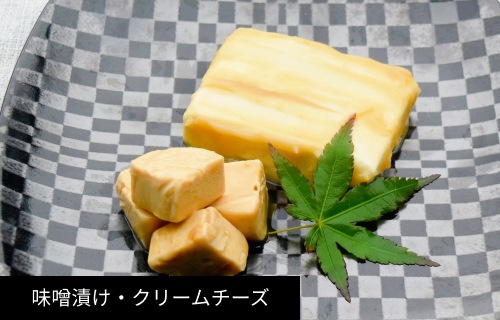 | 原材料 | ・クリームチーズ 白味噌(酒・みりん・濃口醤油・砂糖) ・クリームチーズ(はちみつ) 白味噌(酒・みりん・濃口醤油・砂糖) ・クリームチーズ(黒コショウ) 白味噌(酒・みりん・濃口醤油・砂糖) |