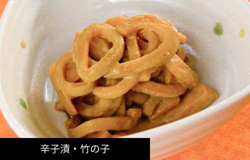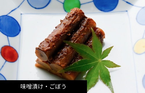 | 原材料 | ・みがきごぼう 赤味噌(酒・みりん・濃口醤油・砂糖) ・ベーコンブロック 白味噌、酒粕 ・竹の子 辛子、調味料(酒・出汁・みりん・濃口醤油・砂糖) |